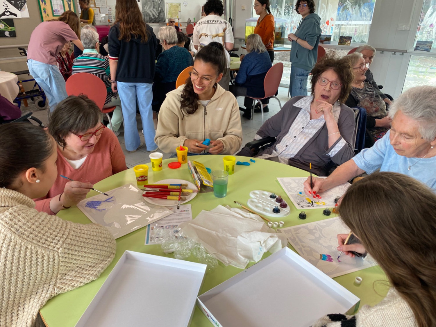 16 élèves de 1G2 et 1G4 ont visité les résidents de l’EHPAD d’Aiguillon quatre fois depuis la rentrée scolaire. Dans le cadre du projet d’EMC sur le lien social, ils ont animé des ateliers intergénérationnels auprès des seniors s’intéressant à leur quotidien et à leurs capacités motrices.