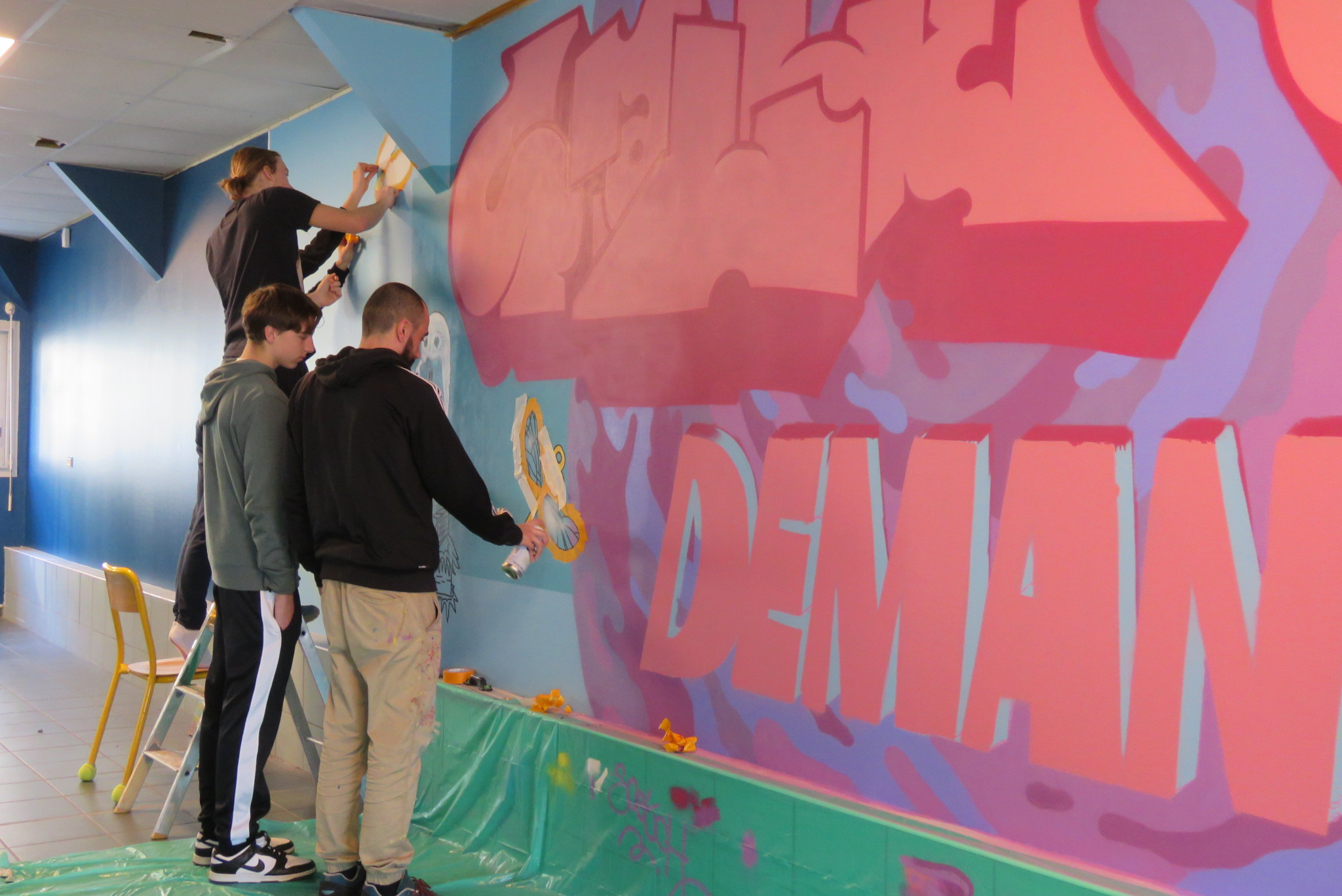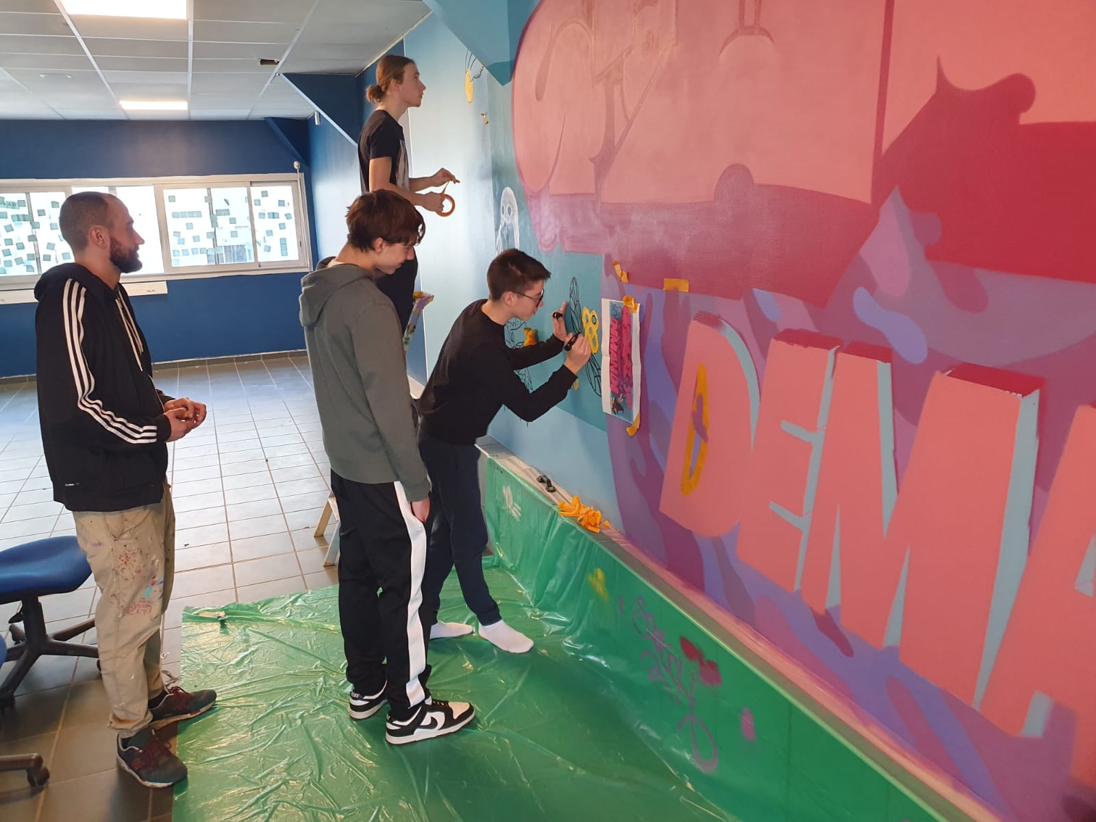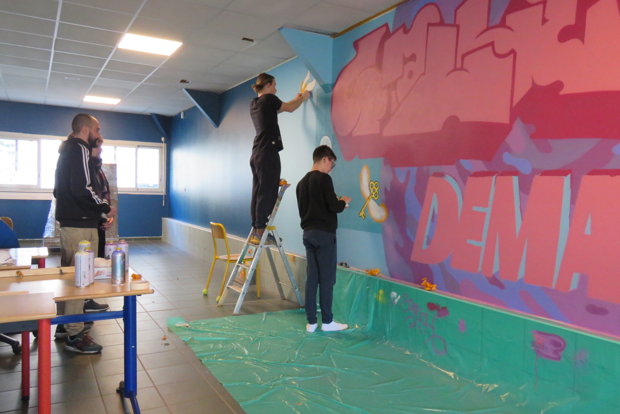 Au mois de novembre et décembre, pendant plusieurs mercredis après-midis, AED et élèves ont repeint la salle, ont fait leurs premiers pas dans le street art avec l’élaboration d’une fresque, ont réalisé des plans, ont envoyé des demandes de devis, ont rempli des papiers administratifs.