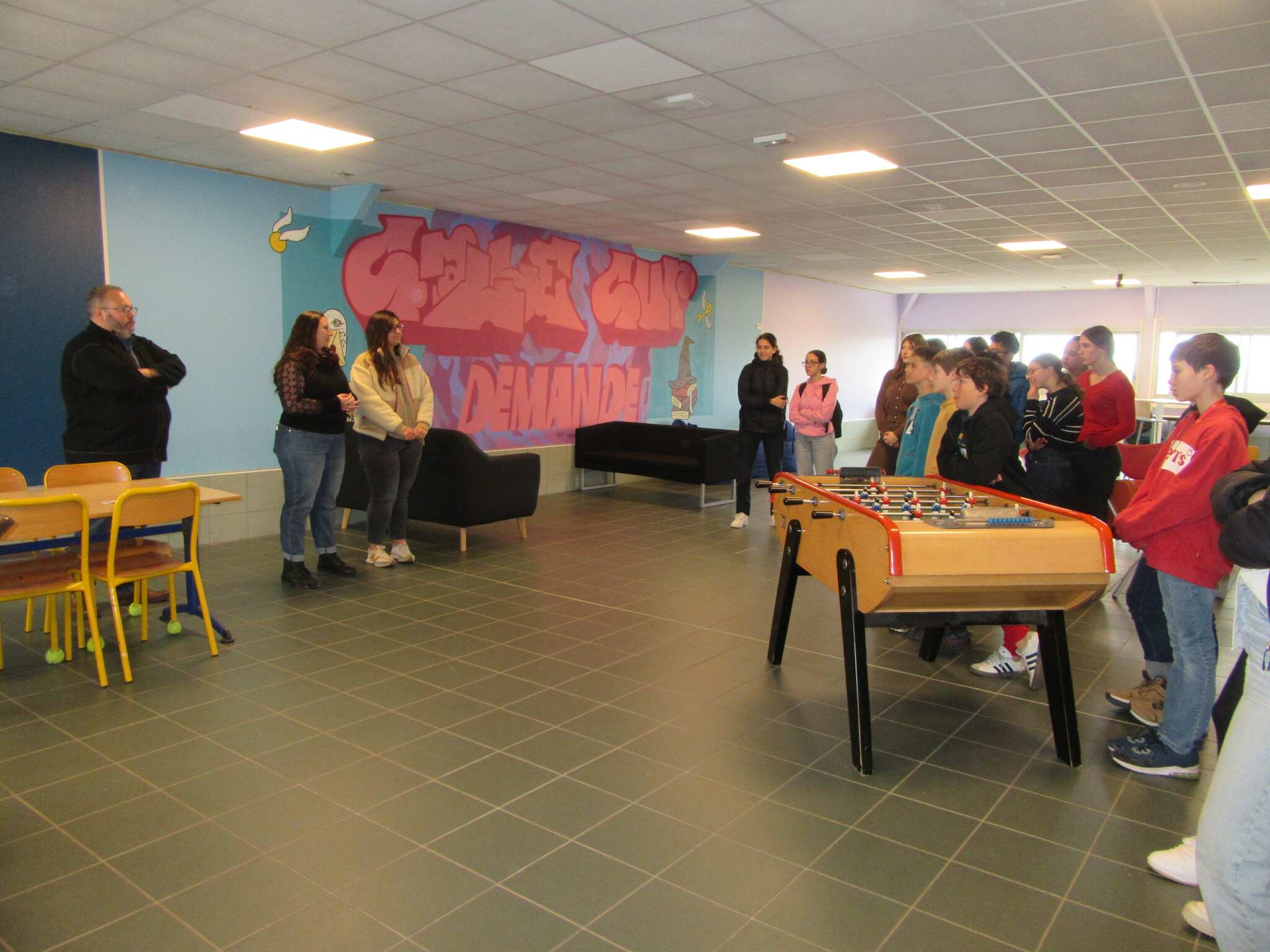 Le jeudi 20 mars 2025, M. BONNET, Proviseur de la Cité scolaire a inauguré la salle du foyer des collégiens, appelé « SALLE SUR DEMANDE ». Le projet a été évoqué en fin d’année dernière, mais c’est véritablement cette année que des élèves de 3e2 et de 3e4 se sont investis pour créer un lieu à leur image.
