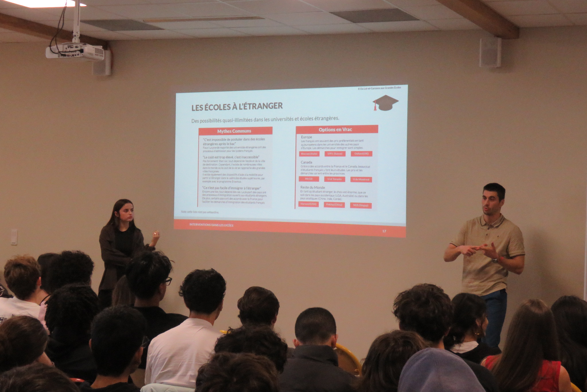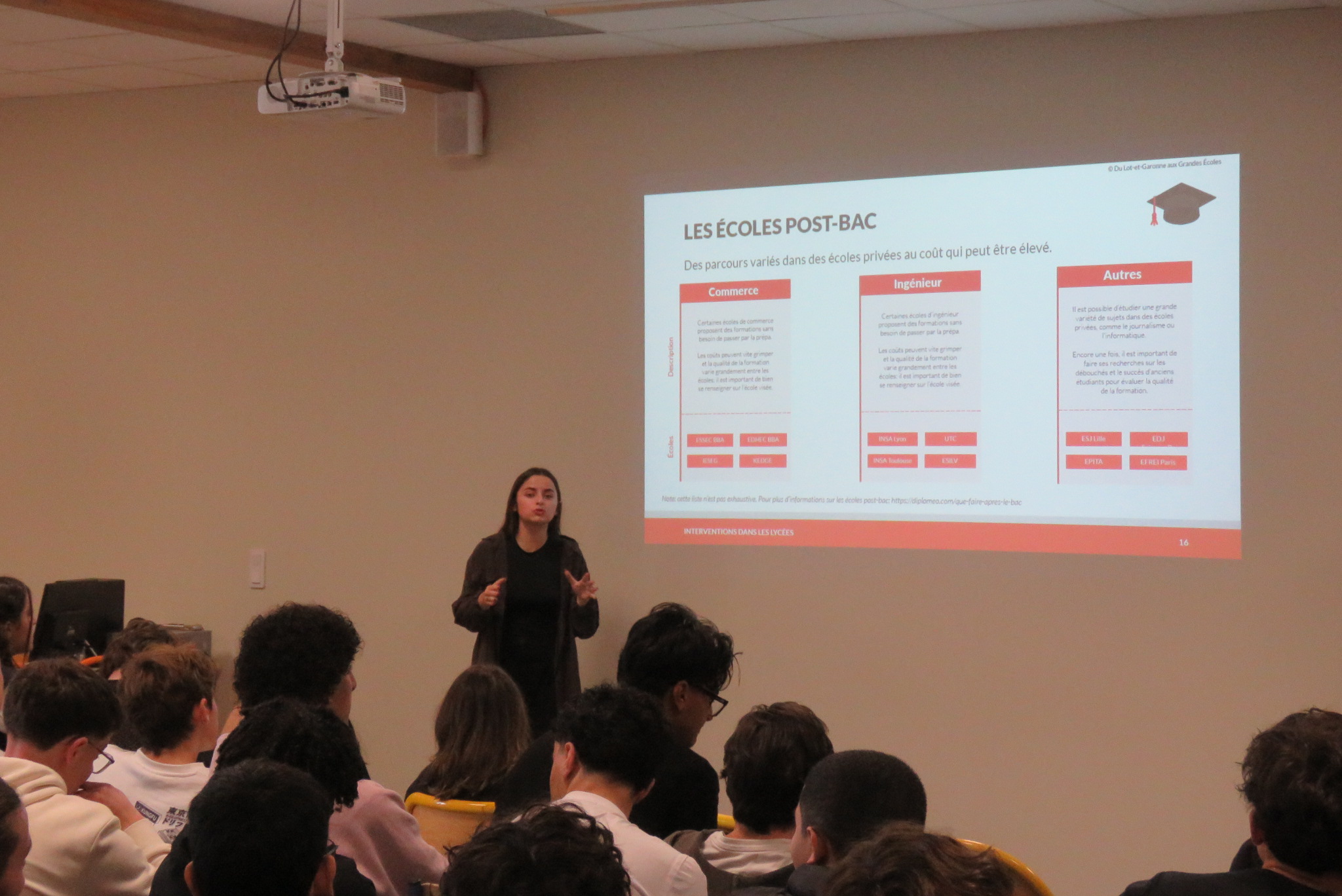 grande école que les élèves parisiens. En cause : les difficultés liées au manque d’information, l’auto-censure et le coût des formations et de l’hébergement. Au cours de la présentation, les nombreux dispositifs d’aide ont été mis en valeur ainsi que le mentorat proposé par l’association « Du Lot-et-Garonne aux Grandes Ecoles ». Celui-ci permet aux élèves de Terminale d’être suivis par un mentor qui les accompagnera et les guidera dans leur réflexion sur l’enseignement supérieur.